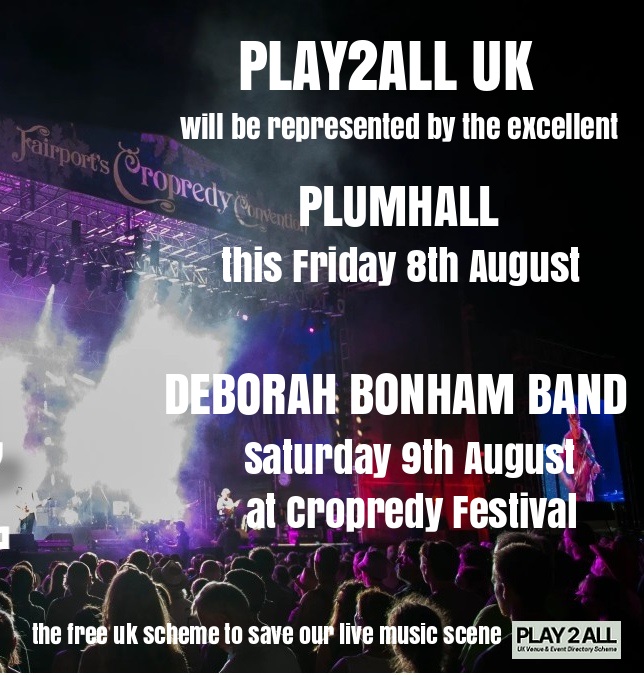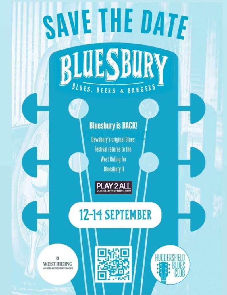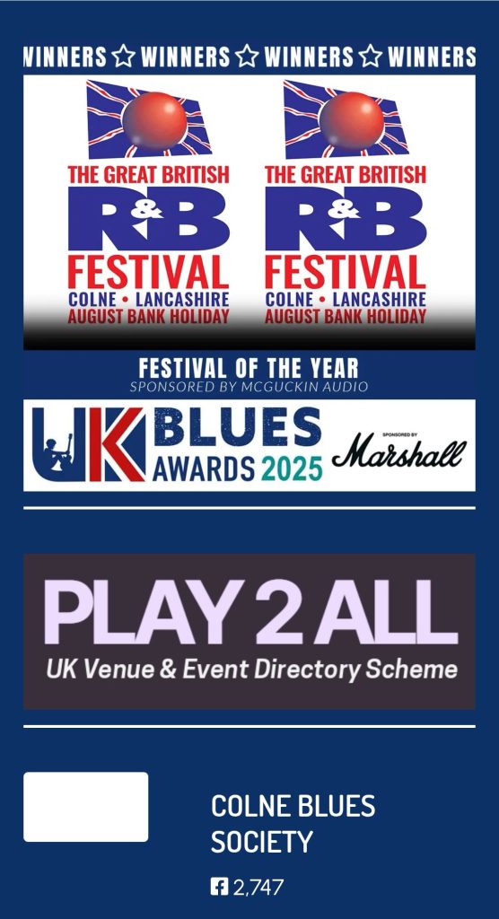 Delighted to have the iconic & long established Colne Blues Festival as ‘Play 2 All UK’ August feature in run up to start of the Directory on Sunday September 1st. The event that started as 2 stage festival in 1990 now runs throughout Colne town with best of the Blues on Main Stages & series of Fringe performances. See Directory page for full programme & website link. ‘Play 2 All’ will be in attendance.